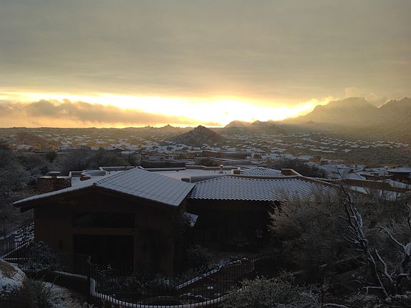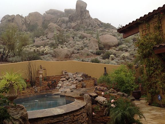 Situated on the side of Troon Mountain. Backyard patio with barbecue faces three-level pool with two waterfalls and upward at the massive granite boulders clinging the mountain. Guest house has views to the south spanning the McDowell Mountains. Includes an indoor pizza oven, large sunken wine room, and a Tuscan-style stone bistro delineated with a tile roof. All cabinets are an alder distressed Tuscan-style and 100% hand-crafted.