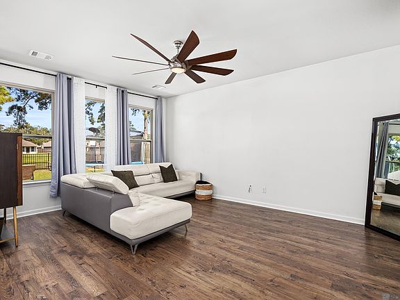 Experience open living, modern finishes, and a serene pond view in Legacy Oaks! Charming 4 bed, 2 bath home offers 1,897 sq ft of thoughtfully designed living space with soaring 9+ ft ceilings throughout. A dedicated office/study provides the perfect spot for remote work or quiet reading. The heart of the home is the chef’s kitchen featuring granite countertops, a gas cooktop, stainless steel appliances, breakfast bar with a stylish accent wall, and a pantry—ideal for both everyday living and entertaining. Built-in beverage cooler for added convenience! Stainless steel Fridge will also remain! The spacious primary suite boasts high ceilings, a walk-in closet, and a spa-inspired en-suite with a double vanity, relaxing garden soaking tub, and separate shower. Step outside to enjoy an open oversized back patio with a spacious, shaded backyard enclosed by a wood and iron fence that overlooks the community pond—perfect for morning coffee or evening sunsets. Brand new inside & outside HVAC units with 10-year warranty! Conveniently located near I-10, Tanger Outlet, restaurants, entertainment, and so much more! No Flood Insurance Required! 100% Financing Available! This adorable home is ready for its new owners so call to schedule your private showing today!