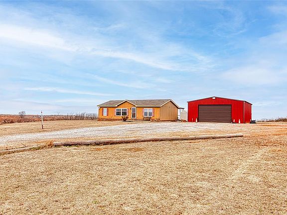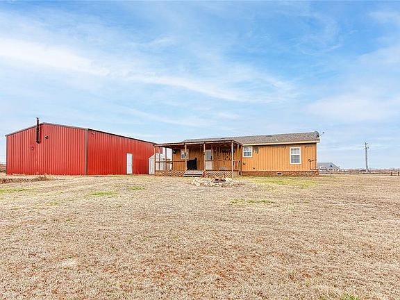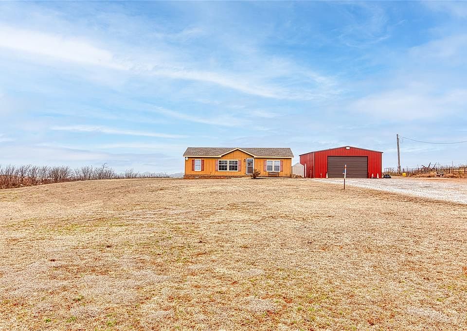 This wonderful 2011 Southern Energy home is nestled on a little over 2 acres (MOL) of space, equipped with a 30x40 shop. The shop has cement floors, electricity & overhead door with garage opener. Watch the sunset from the covered back porch overlooking the spacious pastures that surround you. Weather threats aren't a problem at this property, there is a below ground storm shelter right outside the back door. The interior boasts an open, cozy split floor plan. 2 bedrooms to the left of the living room with a full bathroom, with the primary bedroom and ensuite are to the right. The living room opens into the kitchen where everyone can be part of the entertainment without missing a second. All new flooring throughout the home, make it warm and inviting; plus, it's pet friendly! Call/text for your private showing today! This property won't disappoint.