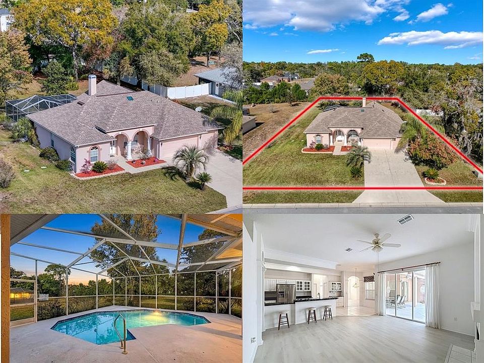 Welcome to Rainbow Woods — a beautifully maintained and highly desirable community in the heart of Spring Hill. Proudly owned by the original owner since construction, this exceptionally cared-for 4-bedroom, 3-bath pool home sits on a spacious ½-acre lot and boasts a long list of major updates already completed for you: a NEW roof (Sept 2024), NEW pool tile and Gunite finish (Nov 2025), NEW interior paint, NEW luxury vinyl plank flooring throughout most of the home (Nov 2025), tile in the kitchen and bathrooms, and a newer A/C system (Sept 2020). From top to bottom, the home reflects years of thoughtful upkeep and pride in ownership. Step through the front door into a bright, welcoming family and dining room combination, filled with natural light from the wide 3-panel sliders that frame beautiful views of the sparkling pool. To the left, the expansive primary suite offers dual closets, a large ensuite with dual sinks, a soaking tub, and a separate shower. A private slider off the bedroom opens directly to the pool—perfect for quiet morning coffee or evening relaxation. Through the family room, an elegant arched entry leads into the sunny breakfast nook and well-appointed kitchen, featuring stainless steel appliances, stunning white showcase cabinetry, extensive built-in storage, a high bar for additional seating, and abundant counter space ideal for cooking and entertaining. The kitchen flows seamlessly into the inviting living room, complete with a cozy wood burning fireplace and beautiful new luxury vinyl floors. Just behind the living room lies a large bedroom paired with the pool bath, offering an ideal in-law or guest-suite style setup. With its direct pool access, this area provides privacy, convenience, and versatility for extended family or visitors. Off the living room are two additional spacious bedrooms with a full bathroom between them. One room features elegant double-entry doors, and both enjoy excellent natural light, giving this wing of the home an open, comfortable feel. Past the kitchen toward the front of the house is a convenient pantry and a tidy laundry room with a utility sink. A skylight-lit hallway leads to the oversized freshly painted 2½-car garage, providing excellent storage, workspace, or room for larger vehicles. Step outside to your private Florida oasis: a screened-in pool freshly updated in 2025, a large covered sitting area with new dual ceiling fans, and lush mature landscaping that wraps the entire ½-acre lot. This outdoor retreat is perfect for entertaining, relaxing, and enjoying Florida living year-round. With its thoughtful updates, meticulously maintained condition, and incredible layout, this one-owner home is a true gem nestled within the sought-after Rainbow Woods community.