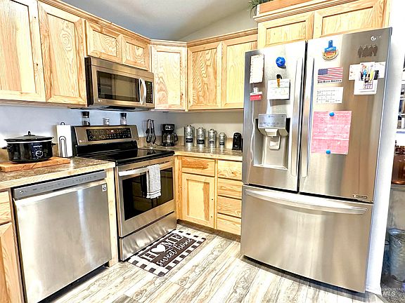 This newly updated manufactured home in the Rustic Acres Community is located just minutes from the Village at Meridian, I-84 on ramp and the Boise Town Square Mall. This home offers a split bedroom floorplan, including a primary with a spacious on-suite and vaulted ceilings throughout. Every part of the house is updated, including the kitchen with beautiful cabinets for plenty of storage and new stainless steel appliances. There is also a covered deck that is not only a quiet place to take a break, but it also adds so much personality to the outside of the home. This home also has a large covered carport to keep your vehicles protected from the seasons. There is a dog park/picnic area located just a few houses down as well. Park rent is $950/mo. Come check it out, you'll fall in love as soon as you walk inside.