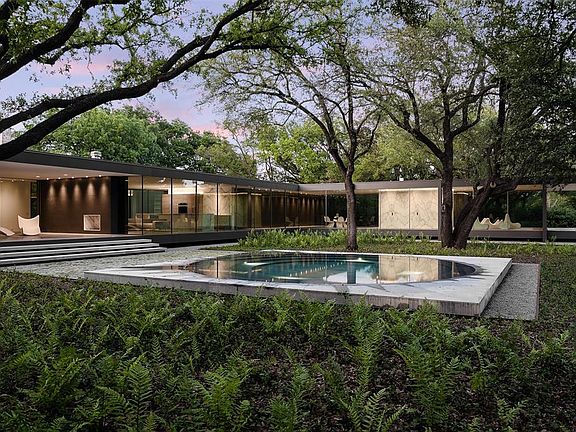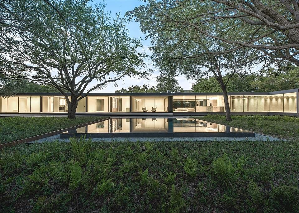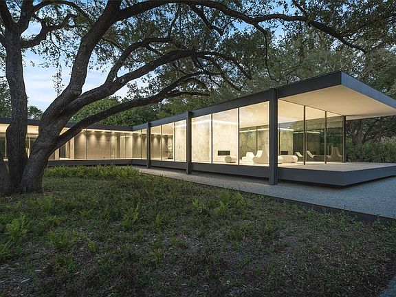 Set on a 1.33-acre park-like lot in coveted Hillcrest Estates among specimen Live and Red Oaks, is one of the most architecturally significant modernist homes recently constructed in Dallas. While the one level footprint is nearly 10,000 sq ft, the foundation is about half, creating a sleek Farnsworth-inspired floating home of glass and steel living in harmony with the minimalist, yet private grounds designed by award-winning David Hocker. Progressive modernist architect, Joshua Nimmo, and interior designer, William Nash, collaborated with high-end builder, Steve McCombs, to deliver a strikingly handsome glass house made of some of the finest materials and appointments, yet energy efficient and low-maintenance. 2020-11-05