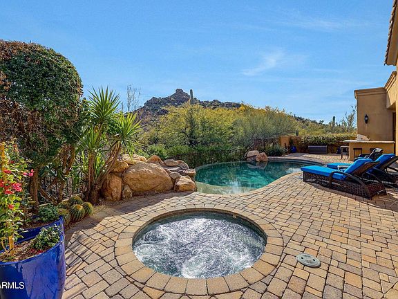 The residence offers breathtaking views of the McDowell Mountain Range from both the front and back. The outdoor oasis beckons with a pool, spa, outdoor kitchen featuring a modernized BBQ area with a new countertop and a fully reconditioned BBQ, fireplace, covered patio and panoramic mountain views. New irrigation system and new landscape lighting around the exterior. A full paver drive and backyard paver hardscaping add a custom touch.