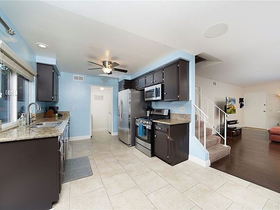 You are going to fall in love with this spectacular 4 bedroom/3 bathroom Cypress Village S&S built townhome. Situated on a very quiet greenbelt this highly desired floor plan gives you plenty of space and flexibility including a main floor bedroom and full bathroom. The main floor bedroom can be opened up to make room for an open work from home office or even expand your living room space. As you walk in the door you will fall in love with the open living room space with dark, laminate wood flooring and a stunning 3 sided gas fireplace with a brand-new log insert. The kitchen features granite countertops, dark wood cabinets, stainless steel appliances (Samsung fridge, gas-range and dishwasher all included),stainless steel side-by-side sink with garbage disposal, tile floors and dining room off of the kitchen. The master retreat is spacious with about 200 sq/ft, plantation shutters and attached bathroom with glass shower doors. Ceilings throughout the home have been scraped and textured, no popcorn! Other amazing features include central A/C, dual paned vinyl windows, inside laundry room, Ring Doorbell, Smart EcoBee Thermostat, window blinds, detached 2 car garage with automatic opener and built-in hanging storage racks! You'll also enjoy your very private backyard covered patio area with very low maintenance and direct access to the garage. This home has all the termite work completed and has been very well maintained and loved! Located in the highly desired award winning Garden Grove School District, local schools include Patton Elementary, Bell Intermediate, and Pacifica High School. The Cypress Village community features 3 pools, 3 clubhouses, hot tub, wading pool, tennis court, and beautiful walking paths and greenbelts. This is the one you have been waiting for, now make it home.