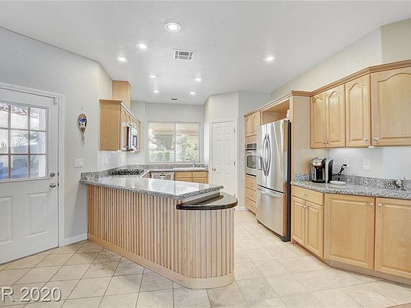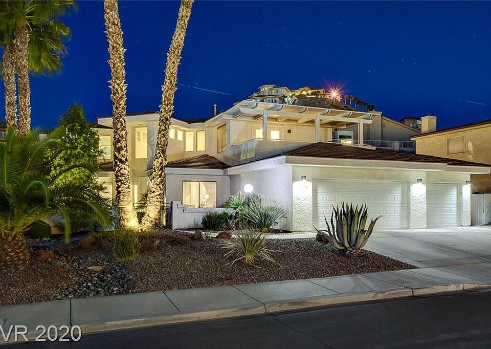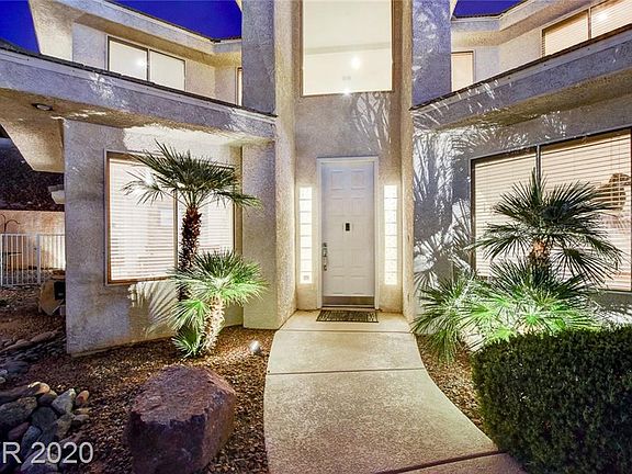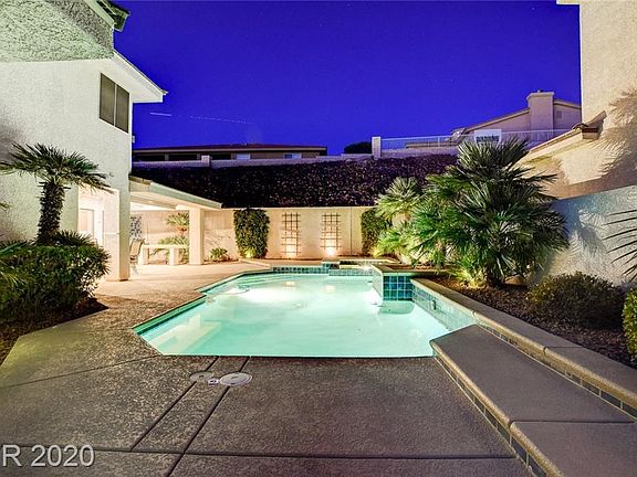 Sensational home in the highly desirable Two Crows community in Calico Ridge. Spacious living and dining area, perfect for entertaining or hanging out with your family. Four nice sized bedrooms and a downstairs den or office. Downstairs bedroom and full bathroom with access to the swimming pool. Courtyard seating with a fountain pond for outdoor relaxing. Backyard has BBQ, covered patio, spa and refreshing pool. Kitchen has stainless steel appliances with pretty cabinets and a window with view of pool Primary room upstairs with fireplace, private balcony with amazing city and Strip VIEWS. Best seat in the house! fresh air beautiful views. Come and see this Spectacular home, your buyers will love it! ,
