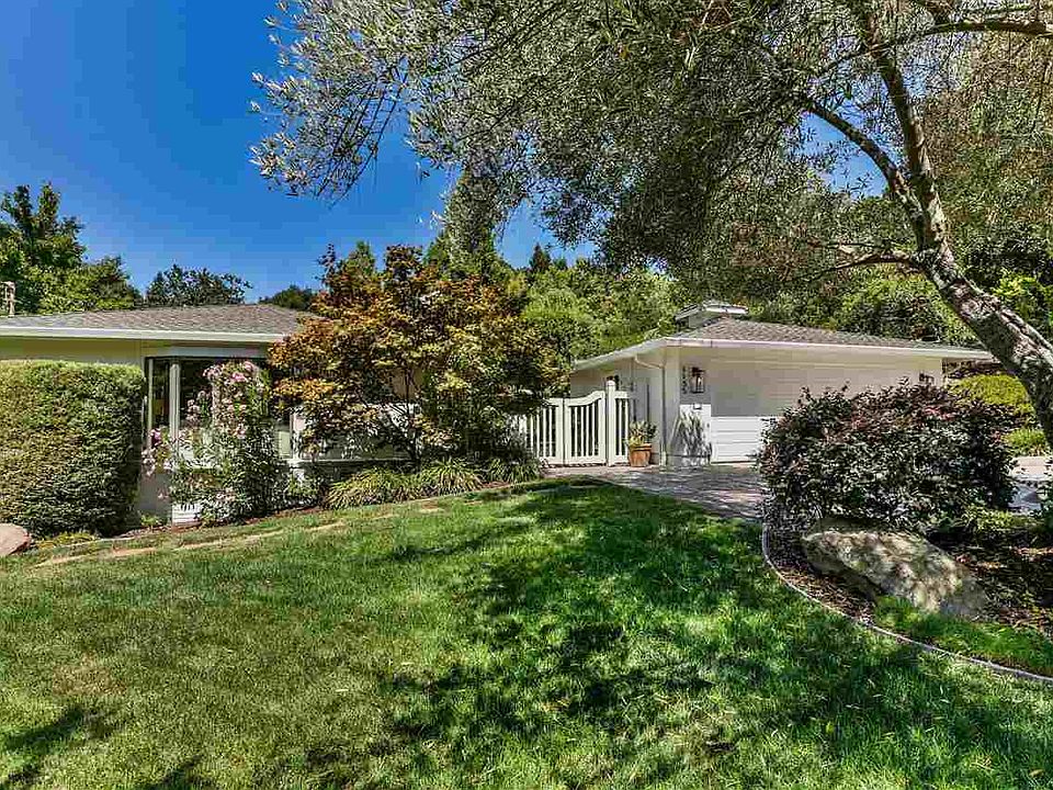 Nestled in prestigious Happy Valley neighborhood, this charming home features 3 bedrooms +a large bonus/office/bedroom w/exterior & interior entrance, two bathrooms & an oversized two car garage. In this light filled home enter to the living room w/fireplace, bay window & formal dining area w/built-in bar. A spacious master bdrm enjoys tranquil views & a wall of closets. The kitchen opens to the family room w/fireplace & large sliding doors open to outdoor entertaining including bench seating, BBQ, lawn, dining area under a pergola & paths leading to play areas & restful garden spaces. Professionally landscaped, expansive, more than 1/2 acre lot, this home has privacy & views of colorful, textural plants & lush trees as well as lawn & play areas. Charming details in this home include built in shelves & desk, vintage tiles, large closets, covered walkway & gated entrance. Newly painted exterior & interior plus new lighting add a bright, modern farmhouse look that blends w/vintage charm.