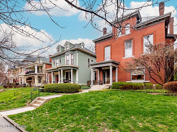 Nestled in along Cherokee Rd in the Historic Cherokee Triangle Preservation District, this elegant classy Victorian has been meticulously maintained and loved by the current family. A covered front porch greets you into this lovely home where you will be greeted into a spacious foyer with a beautiful staircase, wainscoting, gas log fireplace, and guest closet. There are pocket doors leading into the living room with a gas log fireplace surrounded by green marble and flanked by built-in bookcases and is open to the generous sized dining room with bayed window and lovely crystal chandelier. An original butlers pantry with floor to ceiling glass door cabinets make entertaining a breeze as a bar/storage and conveniently located off the dining room and kitchen. The eat-in gourmet kitchen was a winner of the Homebuilders Association Tour of Remodeled Homes - Kitchen division. It features custom white cabinetry, granite counters, some painted brick walls, stainless steel appliances including a gas range with exhaust fan with heat lamps and original pine flooring which creates a comfy cozy feel. A guest bath along with hardwood flooring, crown moldings complete the first floor. On the second floor you will discover a front bedroom (currently being used a family room) with a gas log fireplace flanked with built-in bookcases, a sitting room and an attached closet, a 2nd and 3rd bedroom each with decorative fireplaces and 2 full bathrooms - one with a Jacuzzi tub and the other a standing shower. The third floor has a family recreation space with a pool table, game table, a wet bar with mini fridge, a full bath and nice sized 4th bedroom, along with additional storage. There is a laundry and workroom in the basement. Just off the kitchen is a lovely, covered porch overlooking a garden and brick patio oasis with dry creek bed. The carriage house sits at the edge of the yard and includes a 2-car garage and private one bedroom one bath studio guest space - currently used as an Arbnb and can come completely furnished - minus a piece or two.