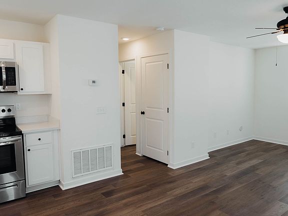 Stylish flooringOpen kitchen layoutModern stainless steel kitchenWasher and dryer in-unitBright interiors