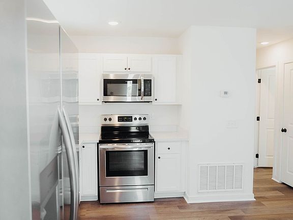 Modern Stainless Steel Kitchen Upgraded appliances including refrigerator, stove, microwave, and dishwasher, paired with bright white cabinetry and quartz-style countertops.