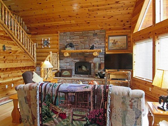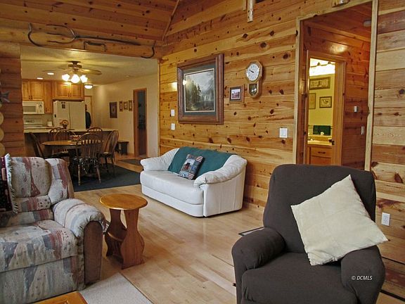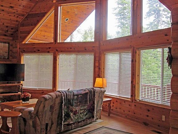 This real log cabin is nestled among beautiful tress on a gorgeous, flat .59 acre corner lot with roads on three sides of the cabin that offers easy access in any season. Huge living area features a beautiful wall of windows, vaulted ceilings with natural wood beams, knotty pine floors, a great stone wall with a wood burning fireplace and direct access to the wraparound covered deck leading out to the custom built fire pit. Main floor kitchen with knotty pine cabinets and doors throughout the the cabin. Kitchen has a countertop bar opening to dining area for entertaining a crowd. Master bedroom on main floor with in suite bath and a large walk in closet. Also 2 main floor guest bedrooms and a full bath make a nice guest retreat. Large sleeping loft with 1/2 bath for all to gather for fun, games and slumber parties. A laundry/mud room goes out to the double car garage with windows, heat and is even ready for washing all you mountain toys and offers plenty of storage. The cabin and yard are in pristine condition with everything well taken care of. It simply doesn't get better than this. Your dream cabin awaits. Most furniture is included.