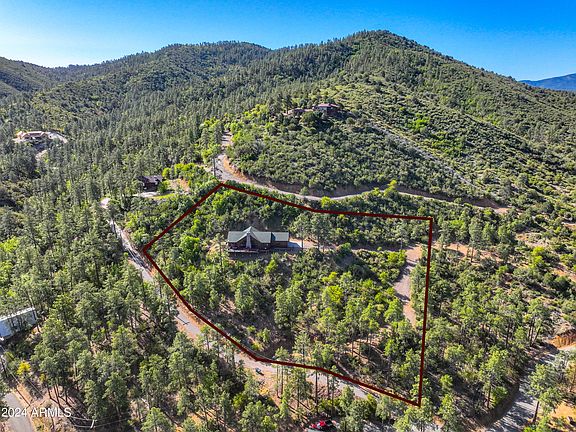 Luxury cabin living in Prescott! Situated on just under 2 acres of ultimate beauty and privacy this luxury custom home will not disappoint! Wrap around trex deck to take in the panoramic mountain and forest views! Absolutely gorgeous tongues and groove beamed ceiling, alder cabinets, wood encased windows, luxury vinyl flooring, custom river rock fireplace. Primary bedroom with huge walk-in shower, dual vanity, built in hamper. Kitchen with alder cabinets, pull-outs, lazy susan, composite sink, touch sensor faucet, stainless steel appliances. Large laundry room, all appliances convey. Private well, 2 car garage. Building plans & site plans available for review at the home. This is Prescott living! Only 3 miles to downtown but a world away!