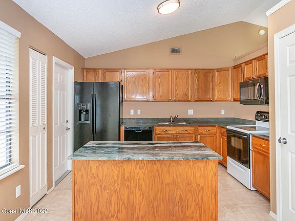 Beautiful, well maintained, 3 bedroom 2 bath with a split floor plan and vaulted ceilings. Attractive Tile throughout with fresh paint. Kitchen features granite countertops plus an island with prep space and additional storage. Open living area and a large Family room with Sliders that lead out to the screened Patio. The Yard Is completely fenced with a newer Vinyl fence. There is also a concrete pad for a shed and plenty of space for a pool and garden. The Master Bedroom suite offers a Walk in Closet. The 2nd bedroom has decorative shelving. Low Maintenance with New AC 2020, water heater in 2021 and Roof replaced in 2008. This home is connected to city water. Minutes away from I-95, shopping and the beaches. Please see agent remarks