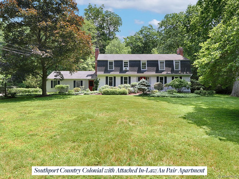 A prime Southport estate location at the Westport line is home to this gracious 5 Bedroom Colonial featuring a rarely found attached main level IN-LAW / AU PAIR APARTMENT with a private entrance, Living/Dining Room, Bedroom and a full Bath. Additionally appreciated, and perfect for today's work from home buyer, is an OFFICE/STUDIO over the barn style oversized detached two car garage. Approached by a long driveway this home is a nature lovers paradise offering complete privacy with the convenience of being approximately 2 miles to Southport Village center, train and harbor. Inside a welcoming Foyer introduces the front to back Living Room with fireplace, formal Dining Room and the charming Family Room with rustic beams, built in bookcases and impressive brick fireplace. This room is open to the Kitchen and the Breakfast Room with atrium door to a two tier deck to enjoy al fresco dining. The Kitchen impresses with abundant cabinetry and counter space including large breakfast bar perfect for gathering friends/family or food prep duties. Adjacent is a mudroom with side door access to the front walk, the laundry/storage room and if desired access to the attached apartment. Five ample Bedrooms occupy the second floor along with generous linen and cedar closet storage. The primary Bedroom offers a walk in closet, Bath with heated floor, double sink vanity and walk in steam shower. A truly private country home just minutes from Southport Village Center, Harbor, Beach and Train