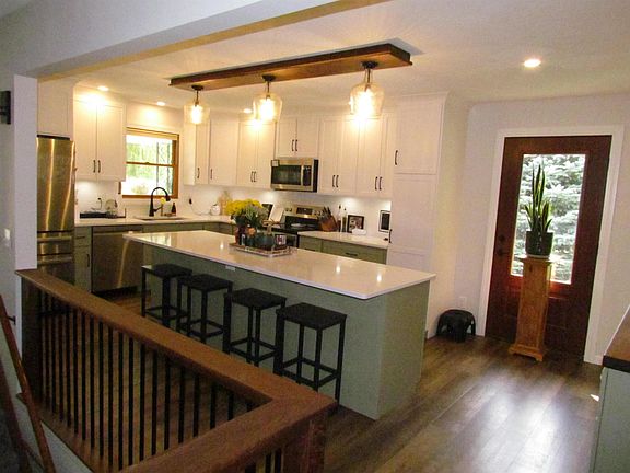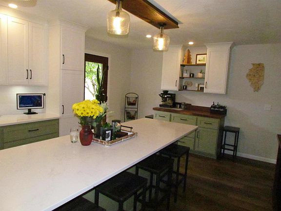 All BRICK ranch on a tucked away street in the Village of Pecatonica. Custom crafted kitchen just completed in 2024! The wood for the cabinets came directly from the mill in Ridott & were built by hand just for this home! Features include a generous center island, coffee bar, pull out shelves, dovetailed drawers, & even a custom pull out for a Kitchen Aid mixer! The maple fronts are painted a soft green on the bottom and white on the top & are adorned with beautiful quartz countertops. Stainless appliances, LVT flooring, dimmable lighting, & black hardware & faucet complete the look. Absolutely stunning! The main bath was updated with a new vanity & tiled shower in 2023. There are 3 bedrooms with hardwood floors. The primary has an ensuite bath with shower, updated in 2018. The living room features a cozy wood fireplace & lovely picture window flooding the room with natural light. The LL family room includes a 2nd fireplace, bar, & adjacent area with LVT flooring that makes a perfect playroom. Still plenty of storage room too! Outside there is a covered side patio & lovely backyard with mature trees. Not much to do here except move in! See it today!