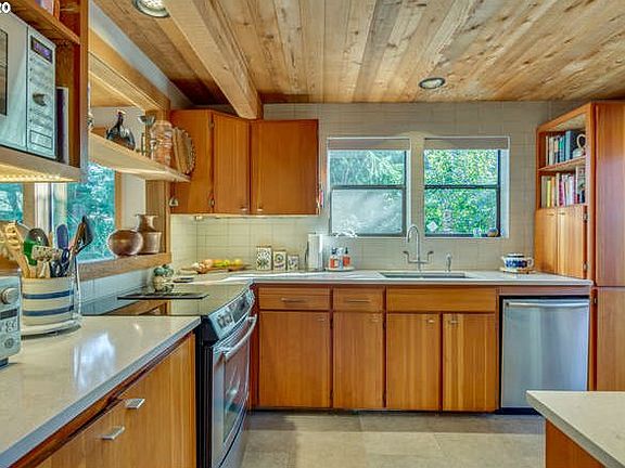 - Ceiling Fan(s), Vaulted Ceiling(s), High Ceilings, Closet, Deck, Dishwasher, Storage, Soaking Tub, Washer/Dryer, Wood Stove, Wood Floors, Bathroom, Tile Floor, Free-Standing Range, Quartz, Walk in Closet, Down Draft, Free-Standing Refrigerator, Sink, Passive Solar
