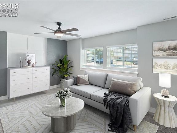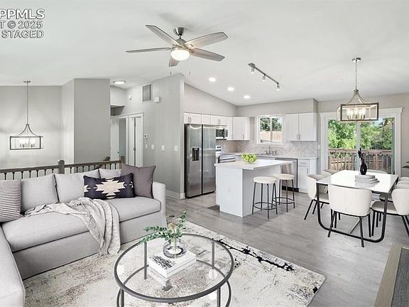 Experience modern living in this fully remodeled bi-level home in Pikes Peak Panorama, where breathtaking Rocky Mountain views create a stunning backdrop from both the front and back yards. Inside, a sophisticated neutral color palette complements the open-concept design, featuring soaring vaulted ceilings and expansive windows that bathe the space in natural light. The seamless flow from the living room to the formal dining area makes entertaining effortless, while the adjacent wood deck provides the perfect spot to take in the serene mountain scenery. The stylish kitchen is a chef’s dream with stainless steel appliances, a chic backsplash, and recessed lighting adding a contemporary touch. The main level includes two spacious bedrooms, including a primary suite with direct access to a full bathroom featuring exquisite custom tile work. The fully finished lower level offers a versatile family room, a third bedroom, and additional space ideal for guests, a home office, or a cozy media area. Outside, the expansive fenced backyard is designed for both relaxation and recreation, complete with a fire pit area and plenty of space for gardening or outdoor activities. Additional highlights include under-stair storage, an extended driveway for extra parking, and a two-car attached garage. Ideally located near top-rated schools, shopping centers, and parks, all within a peaceful neighborhood, this home blends modern elegance with everyday convenience. 3 virtually staged photos included.