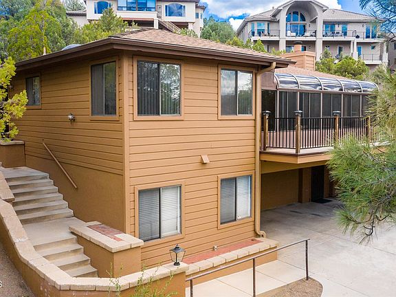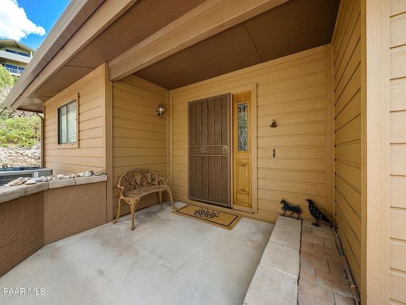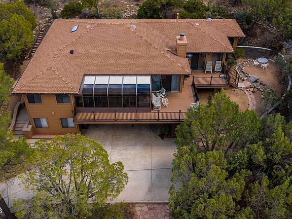 Spacious Family Mountain Retreat, perfect for large gatherings, in the trees with fabulous views of Thumb Butte, Granite Mountain and City Lights. Live on main level with a wonderful great room; custom rock faced gas or wood fireplace; upgraded kitchen with Wolf Gas Range; granite counters; breakfast nook; huge center island and plenty of seating. Enclosed Arizona Room on newer Trex Deck. Downstairs guest room with private entrance could be easily reconfigured for mother-in-law apartment. Walled garden area for children or pets; large alligator juniper and ponderosa pine trees all around the property; flagstone walkway to lots of Manzanita bushes. Large garage workshop with all the work benches included. Heated bonus room with window in the garage for office space or storage. Very close to