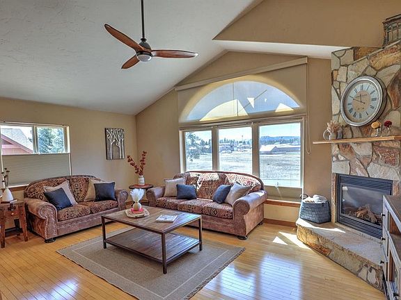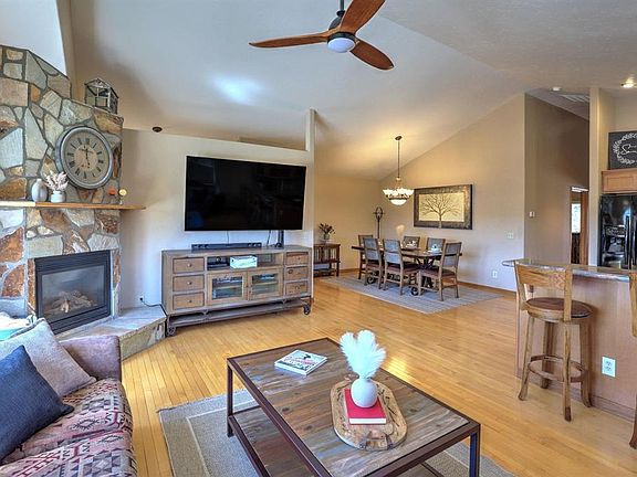 This beautifully furnished, impeccably maintained, corner location, large 3 bedroom townhome features an open floorplan with all the bells and whistles. The floor-to-ceiling fireplace and substantial windows spill warmth and light into the living area. Adjacent is the kitchen bar where your guests will sit and watch the cook 's preparation in the gorgeous, spacious kitchen. Your dining options are at the dining table for 6 or drinks on the balcony, overlooking the open space/park-like setting of 2+/- acres, with mountain views. The primary suite is on this level and features views of the open space/park and mountains, double vanities and walk-in closet. Also on this level is a secondary bedroom, with full bath, which is avalable to the public area. On the lower level, you'll find a second living area, with an electric fireplace that will take the chill off of the winter morns, pull-out sofa/bed for over-flow guests, plus another bedroom, with electric fireplace and 3/4 bath. Insuring privacy for in-laws, teenagers or excited guests, this sweet space has a private patio, with direct access to the open-space and gazebo. Other amenities include air-conditioning, new carpet in the bedrooms and new area rugs, plus an oversized 2-car garage. There are 2 lock-off closets, should short term rentals be desired. This townhome is perfectly located to be in walking distance of the Rec Center, coffee shop or grocery store. The National Forest and walking/biking trails are just minutes away. Partake in making memories at the best little ski area and deepest hot springs in America. It doesn't get any better and is move-in ready. Your linens, kitchenware and family photos make it customized for you. Everything else has been done.