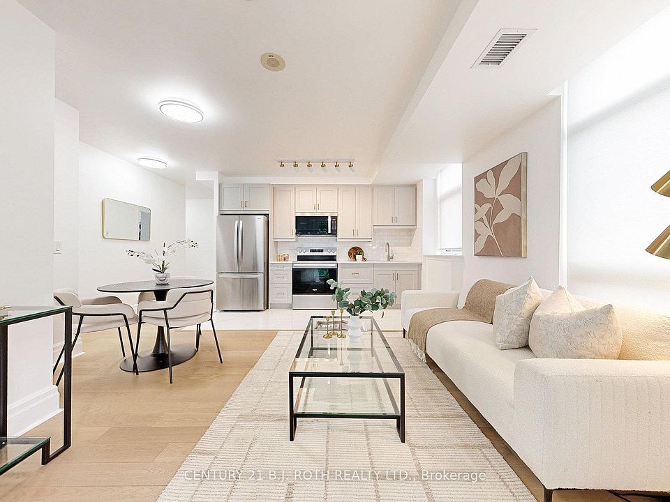 Welcome to this exquisite 1-bedroom condo in the boutique-style James Club residence, nestled in the prestigious Edenbridge-Humber Valley neighbourhood just off The Kingsway in Central Etobicoke. Bright and spacious, this 597 square foot suite has been elegantly updated with modern, high-end finishes and features an open-concept layout, a sun-filled living/dining area, a large private balcony with a serene view of lush greenery, and a modern kitchen with stone countertops, stainless steel appliances, porcelain flooring, a marble backsplash, and a deep under-mount sink. The bedroom boasts a large picture window, designer flooring, and sophisticated fixtures, creating a cozy retreat. Ideally located just steps from Humber River Trails, James Gardens, Loblaws, LCBO, Shoppers, Bruno's Fine Foods, Royal York Subway Station, The Old Mill, and Bloor West Village, with quick access to Hwy 401/427/400. Enjoy luxury amenities including a 24-hour concierge, indoor swimming pool, full fitness centre with sauna, golf simulator, games and billiards rooms, media/party room, guest suite, and visitor parking. Includes one underground parking spot and locker. Whether you're downsizing, investing, or buying your first home, this move-in-ready unit offers upscale living in one of Toronto's most desirable communities.