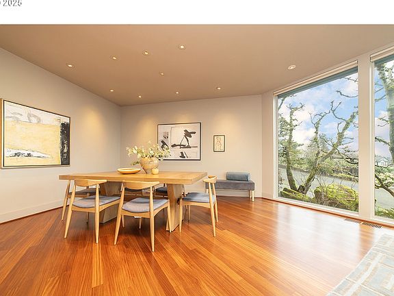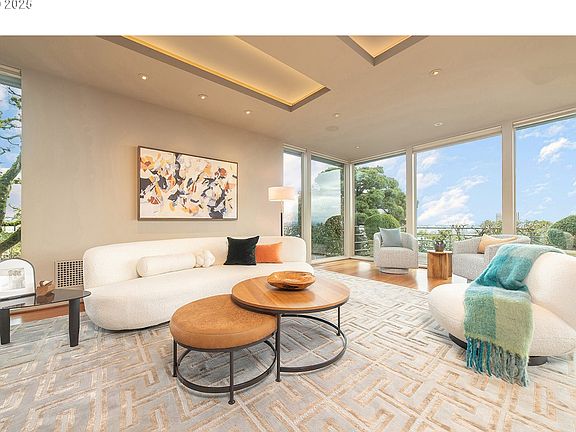 Step into luxury and sophistication as you enter this contemporary masterpiece, where breathtaking city, river, and mountain views immediately captivate from the moment you arrive. With 3,856 square feet of thoughtfully designed space, this home offers the convenience of open concept living without compromising on privacy or comfort. The main level is perfectly suited for easy living, featuring a spacious primary bedroom suite, a well-appointed laundry room, and seamless flow between the living, dining, and kitchen areas—ideal for entertaining. The chef's kitchen boasts top-of-the-line appliances, including Viking double ovens, a SubZero refrigerator, and Miele dishwasher and six-burner gas range. Floor-to-ceiling windows frame stunning views of Mt. Hood and Mt. St. Helens, while the marble-surround gas fireplace provides a cozy, elegant touch. The expansive patio invites outdoor dining and relaxation, and the luxurious primary suite offers a serene retreat with a walk-in closet, custom marble bath, jetted tub, and sauna. The lower level features a family room, grand wine cellar, and ample storage. Set atop Myrtle Court, the property includes an additional tax lot, creating a private, park-like oasis with mature landscaping and raised garden beds. Located near top-rated schools, hiking trails, OHSU, and the vibrant NW 23rd Avenue shops and restaurants. [Home Energy Score = 5. HES Report at https://rpt.greenbuildingregistry.com/hes/OR10228963]