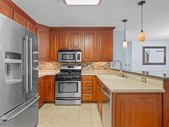 - Description: Kitchen with stainless appliances, tile backsplash, Corian counters, Breakfast bar with Granite top,Flooring: Ceramic Tile