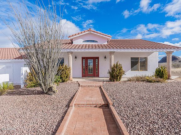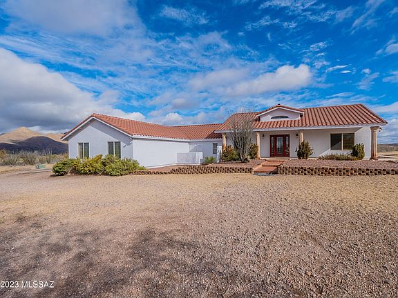 This beautiful home is located in the Sonoita Creek Ranch Community, providing complete privacy on a spacious 10.4-acre property. With stunning panoramic views in every direction, you'll be able to enjoy the tranquility of the great outdoors. The attractive leaded glass front door will lead you into a large foyer with a decorative tile inset, looking into the living room. You'll appreciate the vaulted ceilings, soothing paint color, travertine tile flooring, and the corner fireplace. The kitchen is a cook's delight with mid-tone cabinetry, gorgeous granite countertops, a gas cooktop, a roomy walk-in pantry, and side-by-side double refrigerators. Enjoy dining while taking in incredible views of mountain vistas under the colorful sky as the sun sets. This home features a split-floor bedroom arrangement, and the primary bedroom has another bonus room that can be used as a nursery, home office, or private gym. The three-stall garage has plenty of space for your vehicles and toys! If you enjoy the tranquility of the outdoors, Rio Rico is a family-friendly community that welcomes new neighbors and offers a peaceful and comfortable lifestyle.