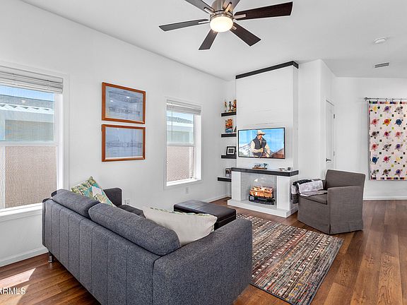 Discover the tranquility of this charming retreat. This 2020, 2 bed/1.5 bath model in 55+ Orchard Ranch oozes with character. Indulge yourself in the amenities at the clubhouse, pool/spa, pickleball, fitness room, & more - ALL included in your monthly lot lease of $560. Unwind in the bright living area adorned with a cozy fireplace. Or, step into the open and airy kitchen equipped with white appliances, extra cabinets, custom pull-out spice rack, and whimsical geometric backsplash. The rich warmth of the luxury vinyl floors flows throughout the home and leads to the bedrooms where you will find the peaceful owner suite. Opposite, is the second bedroom which offers the perfect space for your creative pursuits. Slip through the backdoor to discover a fully fenced yard with a quintessential picket fence and backdrop mountain views. This home has many special features including, tiled backsplash in bathrooms, added extra cabinet storage, garden tool storage, finished and insulated shed with workshop, custom window shutters on front windows, and protective sunscreens. You will love the thoughtful touches and this home will entice you to become the artist you dreamed to be. 24 x 40. Approx. 894sf livable & 66sf porch. Buyer to verify size.