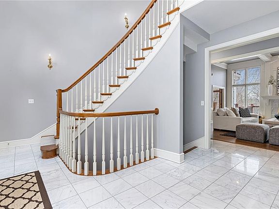 The main level features a grand entry w/ curved staircase, soaring ceilings, & marble floors. The beautiful oversized living room w/ hardwood floors, box beam ceiling & fireplace make it a perfect spot for cozying up.