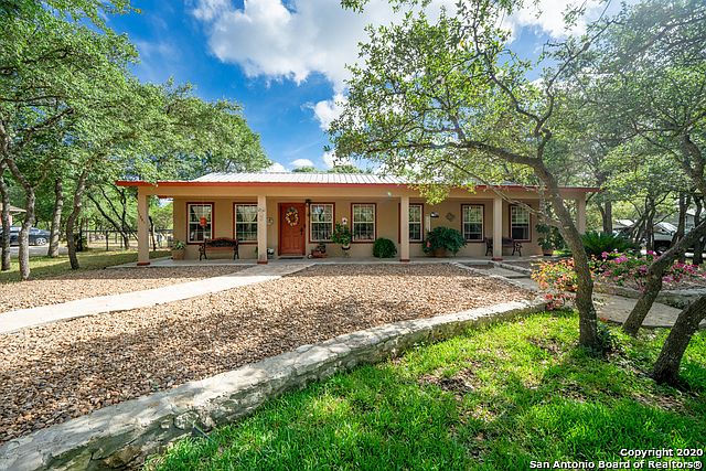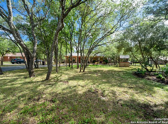 Beautiful Curb Appeal in a Country Setting in the well established Beverly Hills Neighborhood. The Ranch Style Home is steel constructed with Mold/Burn Resistant Foam Insulation R50. The Stucco house has a front and back porch with 1560 SF, 1 story 3 Bdrm 2 Bath house on 1 acre of land. PLUS, the property also includes a separate detached 400 SF cottage not included in the MLS price/SF with Central AC/Heat with private driveway (refrigerator conveys, but washer/dryer unit does not). Previously used as an Airbnb. The house is surrounded by mature oak trees, backyard trees can be lit at night, a wood deck for entertaining and an in-ground pool. Fruit bearing trees (2 apple, 1 pear, 1 loquist, 3 peach) and a small goldfish pond. A chicken shed with mature chickens, and two side by side 15X20 sheds (shelving and cabinets do not convey). Fenced in area for garden or animals. Water Well reaches 440 ft into the depths of the Edwards Aquifer during droughts never has gone dry. Room for RV/Boat parking. The house is close to La Cantera, Alamo Ranch, The Rim, UTSA, SeaWorld, and great NISD schools.