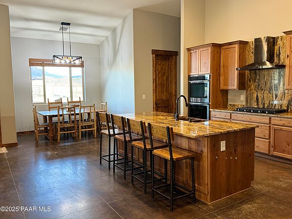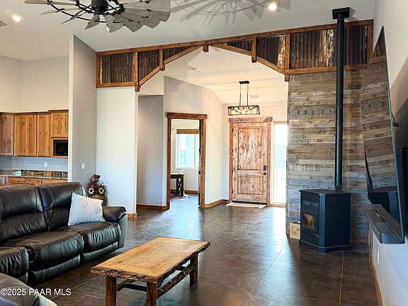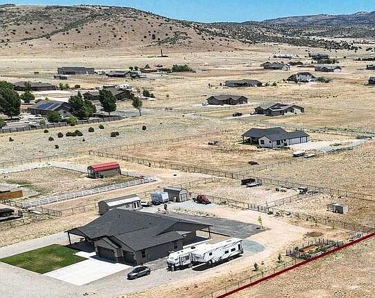 Don't miss this beautiful home located in Prescott Prairie Subdivision. The Home features 2601 Sq ft open floor concept, 4 Bedrooms, 2.5 bath, 1209 sq ft 3 car oversized garage & RV Hookups. The home has custom concrete floors, Knotty Alder Cabinets, Granite countertops throughout. Great for entertaining family and friends. Covered front, side and back patios great for entertaining, or just relaxing taking in the views of the mountains. There's a grass area out front on auto sprinklers, mixed with graveled landscape and irrigation. This 2 acre lot is completely fenced with two seporated fenced pasture areas. Has a large garden bed area, mixed with fruit and shade trees. 13x30 insulated out building that can be used for office or workshop Which has electric climate controlled mini split.