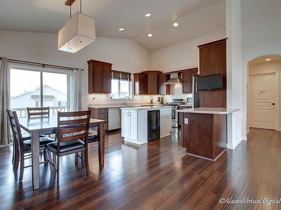 Back On Market. Buyer couldn't finalize financing. Delightful reverse living two story home. The upstairs is an open floor plan encompassing the kitchen, dining area, and living room, all with a vaulted ceiling. The home has dark laminate flooring throughout with the look of hand scraped planks. The kitchen features includeâEUR" pantry with a glass door, cherry cabinets with crown molding, solid surface counters, SS and an island in a contrasting color that has a nook for a microwave and a wine fridge. The master suite has large windows to view the beautiful mountain range, it also has vaulted ceilings, ceiling fan, walk-in closet with built ins, bathroom with a glass & tile shower, jetted tub, & double vanity. There are three decks, one at the entryway, one off the dining area, & one off the downstairs family room. The garage has a tandem space to allow for three cars.