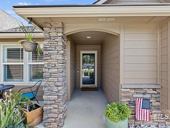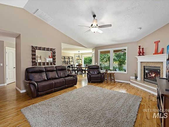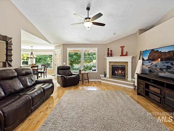 Welcome to this beautifully maintained single-level home with an inviting bonus room upstairs. Boasting four spacious bedrooms and a separate office, this residence offers both comfort and functionality. The elegant interior features vaulted ceilings, hardwood floors, and a cozy gas fireplace. The updated kitchen, equipped with stainless steel appliances, is perfect for culinary enthusiasts. Retreat to the primary suite, complete with a soaker tub, walk-in closet, dual vanities, and direct access to the pergola-covered patio. Enjoy the large backyard with garden boxes and a storage shed, ideal for outdoor activities. Located in a serene neighborhood, you'll be within walking distance to community fishing ponds, scenic pathways, and lushly landscaped common areas, all while being close to downtown Star.