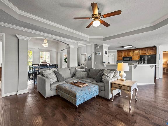 An oasis in Madison! In-ground pool, large fenced backyard, no HOA, Madison City Schools, a saferoom/closet, beautiful flooring, open concept and more! Step onto the patio to enjoy the beauty of the outdoor living space, complete with pool, fire pit, raised garden beds and lush landscaping. Entering the foyer, you are greeted by engineered hardwood floors that flow throughout the main living, dining and kitchen areas. The layout connects the living room, dining areas and kitchen, creating the perfect space for entertaining family and friends. Escape to your own private retreat in the master suite with a spa-like bath with large tub, separate shower and dual vanity. Make it yours