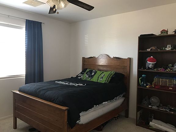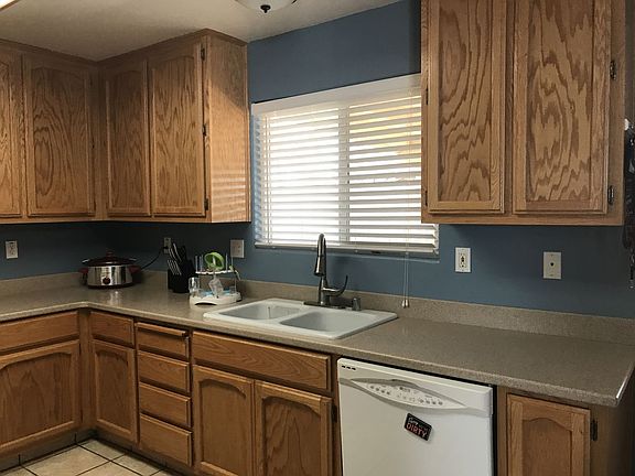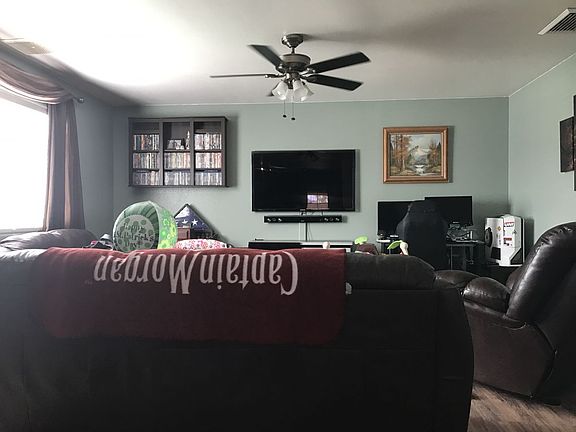 This 2006 built home has three large bedrooms , a spacious living room and plenty of kitchen cabinets! Kitchen counter tops are corian and their are lots of custom cabinets. This kitchen has dishwasher, range, microwave, and refrigerator. Laminate flooring in living room, dining area and hallways. Ground mounted cooler and finished garage complete this home. There is a covered patio and shed in the back.