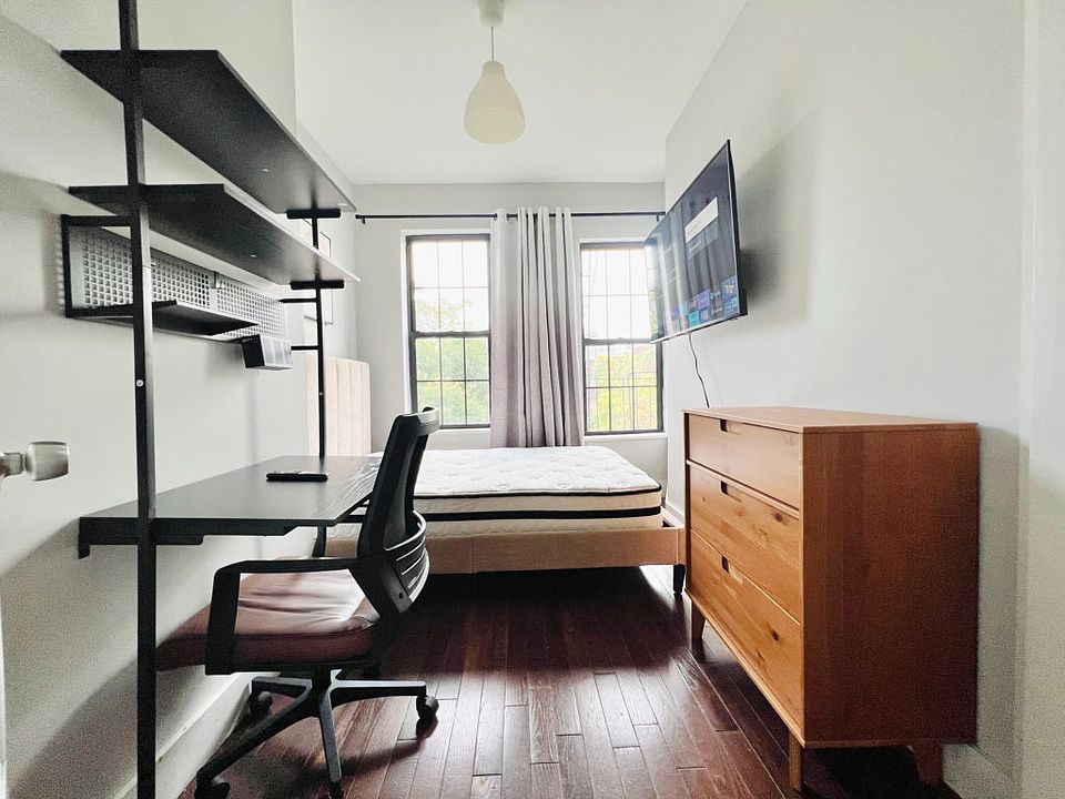 Furnished room in a stunning duplex apartment with 14 ft ceilings, new hardwood floors, and abundant natural light. The apartment has been recently gut renovated and thoughtfully designed for modern living. Apartment Features: 5 bedrooms, 2 bathrooms Fully furnished room: bed, mattress, closet, nightstand, desk, chair, curtains Shared living space with sofa and kitchen table Modern finishes throughout Neighborhood & Lifestyle: Located in prime Bushwick on Willoughby Ave & Knickerbocker Ave, just 1 minute to Maria Hernandez Park and steps from cafes, restaurants, gyms, and bars. Transportation: L train: Dekalb Ave station M train: Central Ave station Quick commute to Manhattan Utilities & Fees: $150/month (internet, gas, heat, hot water) $30/month cleaning service One-time prep fee: $175 (inspection, cleaning, admin) Amenities: Washer/dryer in building High-speed internet, TV, AC included