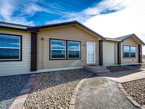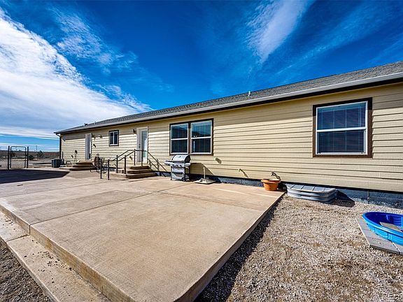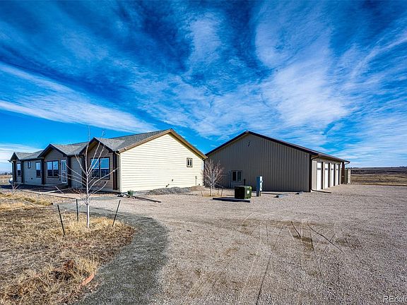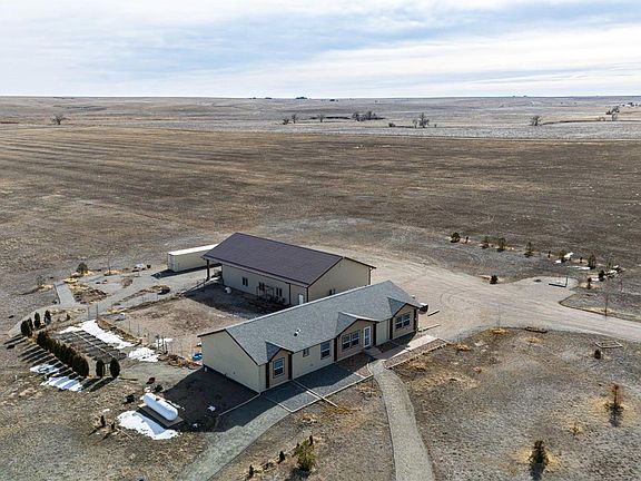 This beautiful home features a split-bedroom floor plan with 4 bedrooms and 3 bathrooms, including 2 primary suites. It boasts an open-concept layout where the kitchen, living room, dining room, and family room flow seamlessly. The kitchen provides ample cabinet space, a large island, and a spacious pantry. Personalize the basement to your taste. Enjoy the expansive concrete patio while watching the kids play in the fully fenced yard. The 2,400 sq ft shop/outbuilding has 4 overhead garage doors, 2 man doors, and 5 windows. The shop also includes 220V and automatic door openers, concrete, and an overhang carport area. Stroll the property and admire the well-maintained driveway and parking areas with a gravel base. Numerous trees and shrubs benefit from water supply. This sizeable rectangular parcel extends east to Comanche Creek, providing year-round access to water for your livestock or horses. Let's not forget the wildlife that frequents the creek! Doves, deer, antelope, a variety of waterfowl, and more! Surrounding the home are breathtaking views of precise mountain ranges, open skies, and expansive plains. Enjoy peace in the wide open.