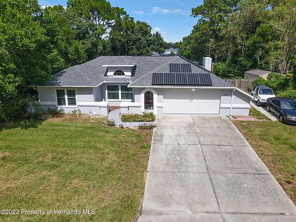 YOU'VE FOUND YOUR DREAM HOME!... and it has everything you could imagine including WHOLE HOUSE SOLAR (2019) nestled among mature shade trees on over half an acre. Step inside the double door entry of this stunning home to the living room / dining room combo and imagine enjoying your next dinner looking out the pocket sliders to your expansive backyard beyond the recently resurfaced, solar heated swimming pool. You'll notice the newer luxury vinyl plank flooring and high ceilings throughout this recently, completely renovated home. Control your lighting with Alexa or google using the six smart switches conveniently installed in the kitchen, dining room, family room, over the fireplace, living room, and in the lanai. All of the windows, sliders and pocket sliders have been updated with hurricane glass except the front doors and door leading from the pool bath to the pool area. There are 3 sliders leading out to the pool! As you walk into the open kitchen, you'll be impressed by the large stand-alone island with sink and electric, and the luxurious updating that includes recessed lighting, granite countertops, modern cabinets, newer black stainless-steel appliances and a convection oven with an induction cooktop. A double door closet pantry and generous cabinets and drawers provide ample storage space for all of your cooking and storage needs. There is an adjacent, cozy family room that offers an attractive stone faced, wood burning fireplace for entertaining guests on chilly nights, and there are pocket sliders leading to the pool area. The convenient split bedroom plan allows for privacy with the master bedroom featuring double walk-in closets and also sliders leading to the pool. The master bathroom has been updated with double sinks, modern cabinetry and stylish granite looking counters. The spacious 2nd bedroom has 2 double door closets, and the 3rd bedroom has a walk-in closet. Storage should not be a problem in this home. The 2nd bathroom, pool bath, features double sinks, granite looking counters and a versatile step-in jetted bathtub. The covered lanai just off of the dining room and family room is the perfect place to unwind and relax by the crystal-clear salt system pool. Set the mood with your choice of lighting color with the remote-controlled LED pool light. The screens were recently replaced, and the automatic pool vacuum is included. This well-maintained home has so much more to offer. Newer roof (2018), newer AC (2018), newer garage door (2018), newer water filtration and water softener, 10x16 shed with electric featuring a concrete floor, 10x21 concrete RV/boat pad with a 240v and 120v electric nearby, a 50-amp plug located near the garage door, 8x17 paver patio in the back yard, oversized 2 car garage, inside laundry area with wash sink, newer irrigation system and fenced back yard. Fully insurable repaired sinkhole with documents available. NO HOA, NO CDD! Minutes to the Suncoast parkway for quick access to the airport, Tampa, Clearwater and St. Pete Beaches (Ranked in the top 5 Beaches in the US), also close to the famous Tarpon Springs Sponge Docks. Conveniently located close to restaurants, shopping, schools, and hospitals.