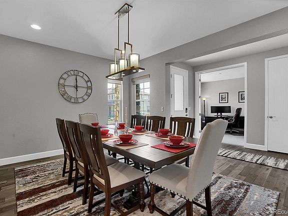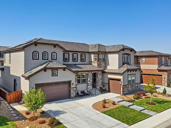 **Welcome Home** You will be amazed with this STUNNING 4 bedroom, 5 bath home located in Stepping Stone. Upon Entry you will be greeted with comforting natural light from the many windows and open living space. A private office with french doors will be on the left and a formal dining room with pass-thru on the right. The Great Room has two-story ceilings, gas fireplace with floor to ceiling stone, and custom wood and carpet flooring. The gourmet kitchen has lavish quartz counters, an enormous center island with seating, built-in stainless steel appliances; including gas cooktop, two ovens, microwave, dishwasher and wine cooler; a walk-in pantry, Butler's Pantry, Morning Room/Breakfast Nook with walkout to outdoor living area and access to the mudroom and one of the two garages. A main-level bedroom with private bath and a guest bath complete the main level. The Upper Level Master Suite features a large bedroom, two walk-in closets and a spa-like bath with free-standing soaking tub and luxurious shower with bench. Two Additional bedrooms, one with private bath, an additional full bath, loft and laundry complete the upper level. The basement has over 2000 square feet of unfinished space, including a rough-in, waiting for you to use as you see fit. The outdoor living space in the back is fenced and has a covered patio, raised garden bed and relaxing water feature. The main garage is a 3-car tandem with 220v Electric Vehicle charging Port and epoxied floor. The Single bay garage also features a 220v Electric vehicle charging port and epoxy coated floor. Other upgrades and features are the Tesla Solar Panel System, landscape lighting, dual furnaces, dual A/C units, dual water heaters, built-in bench seat at entry of main garage and plenty of storage and closet space throughout home. Neighborhood features: Community clubhouse, swimming pool, 7-miles of trails, 2 playgrounds, 5 parks, & disc golf course. Close to schools, parks and shopping. Easy access to I-25 & Hwy 83.