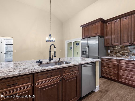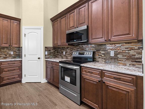 Active Under Contract - Accepting Back Up Offers BRAND NEW LUXURY HOME without the year-long wait for it to be built or unknown final cost!! NEW CONSTRUCTION, MOVE-IN READY!! PAVED ROAD. The only thing you need to do is decorate to make it your own! Offering 4 bedrooms + 2.5 bathrooms + 2 car garage nestled on over a 1/2 acre in a great location close to shopping and zoned for the county's newest schools (K-12)! This Craftsman-style home with country appeal, stone accents, dormers, and window shutters - offers you that southern country feeling! NO HOA! 2,069 sq ft living space; 2,765 total. In the rear of the lot, beyond the backyard, it was left wooded for that privacy everyone desires - no rear neighbors EVER to look at and no one to look at you! The stone entry way and front door welcomes you and your guests into the grand center of the home with large open great room, island-style kitchen and dining room all with 10' ceilings! The high ceilings and open space offers you a light, bright, spacious feeling where your family can gather for years to come! Every inch of this custom home is upgraded and attention was paid to every inch and every detail including designer faucets and lighting, upgraded baseboards, upgraded windows/sliders, and continuous Luxury Vinyl Plank flooring throughout the entire home (no carpet)! The upgraded kitchen offers stunning granite countertops with the modern large, single-level island with breakfast bar big enough for the whole family! Warm rich real wood upgraded 42' soft-close cabinets with a stunning backsplash for that finished luxury look and feel. New stainless steal appliances! Generous-sized pantry! The builder's impressive 'Signature Laundry Room' of this custom home will make this your favorite place in the home - you'll take pleasure and pride in organizing your home and family from this amazing space! It offers matching granite counter tops and under-mount sink (instead of a plastic laundry tub), upgraded real wood cabinets (with upper cabinets too) with extra countertop and cabinet storage space that RIVALS the kitchen! The home has a split floor plan offering privacy to the owner's suite with large ensuite bathroom! Double doors open up into the private master bedroom with a high tray ceiling and two large walk-in closets! The ensuite bathroom is a SPA RETREAT in itself with a large tiled soaking tub, separate over-sized, floor-to-ceiling tiled walk-in shower with stone floor and designer shower head and frameless glass door, dual granite vanities and dual sinks, matching real wood upgraded cabinets with framed mirrors, designer faucets and lighting, and a separate toilet room for privacy! There is a half bath off the great room for your guests which is also conveniently placed by the door to the garage for the quick access when outside! On the opposite side of the home are the 3 additional bedrooms with second full bathroom. The middle room is set up to be a bedroom or a flex room for an office, gym, media den, or play room! There are no small narrow hallways in this home-generous space everywhere! Sip your coffee on your back covered patio in the mornings! Multi-zoned sprinkler system and landscaping! 1-year Builder Warranty provider by LDT Construction, Inc. Quality Custom Builder. Minutes from shopping, restaurants, a hospital, movies, schools, Buccaneer Bay Water Park, kayaking the crystal clear Weeki Wachee River, sunsets at Pine Island, boating, fishing, swimming w/the manatees. Only 1
