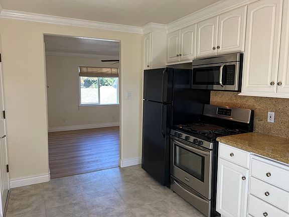 Upgraded 2 Bedroom in Hayward! Conveniently located apartment home features new luxury vinyl plank flooring throughout, sunny eat-in kitchen with granite counters and backsplash, custom raised panel cabinets and drawers, stainless steel gas range, dishwasher and built-in microwave plus GE refrigerator. Living room with crown molding, storage closet and lighted ceiling fan, both bedrooms also feature lighted ceiling fans and custom window treatments, full bath with crown molding and shower over tub. Dedicated parking for one car. On-site laundry. Common patio area. No pets. Non-smoking property. Tenant pays for all utilities including garbage.