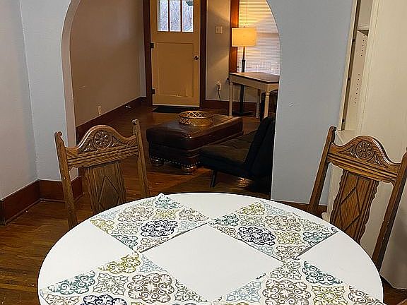 It’s a cozy home with original wood floors through most of it. Newer AC and heat unit. Can sell some furniture with the house. It has original archways between rooms. Room off the family room can be a bedroom or an office. Back door and front door entrances.