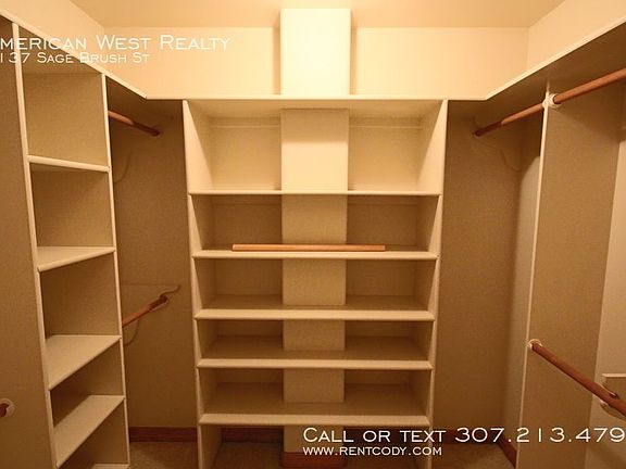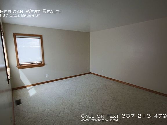 Upstairs carpet will be replaced in August 2018. This beautiful townhouse was built by Bill Overfield and shows quality throughout. The main floor includes all your primary living space. Master suite with walk-in closet and a private, full bath with dual vanities. The kitchen has plenty of storage, fridge, oven and flat-top stove, dishwasher, and microwave. Living room has vaulted ceilings, gas fireplace, and sliding glass door leading to back deck. Washer/dryer (included), a guest bedroom, and guest bath are also located on the main floor. Basement is fully finished with a family room, large bedroom with en-suite bathroom, hobby room, and a beautiful bathroom with jetted tub and separate walk-in shower. There is an attached 2-car garage with lots of built-in storage and work bench. In back is a large deck and storage shed, low maintenance landscaping, and plenty of privacy. NOTE: Neighbor may be willing to maintain the front lawn! All leases are subject to a $20 Resident Benefits Package. You can review the benefits under TENANT RESOURCES APPLICATION AND RENTING POLICY or contact the office for more information. _____________________ Information presented is deemed reliable, but is not warranted. Interested parties are responsible for conducting their own inspection to confirm the accuracy, completeness, currency, and status of all information before renting any property. _____________________ General requirements: All occupants 18+ must complete an application $30 application fee per person Submit a government-issued picture ID Prove combined income of 3x monthly rent To see our most updated list of rentals or learn more about our screening process, visit the American West Realty and Management website. _____________________ INVESTORS: are you looking for professional property management or an agent that can help you sell or expand your investment portfolio? Contact American West Realty and Management today to learn about our services! Air Conditioning Central Air Ceiling Fan Deck / Porch Fencing Fully Fenced Garage Heat Forced Air Heat Gas Fireplace Jetted Tub, Hot Tub, Or Spa Kitchen Dishwasher Kitchen Garbage Disposal Kitchen Microwave Kitchen Refrigerator Kitchen Stove / Oven Shop Or Work Space Sprinklers Automatic Storage Shed Utility Black Hills Energy Utility City Of Cody (Water, Electric, Sewer, Trash) Washer/Dryer In Unit