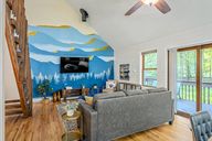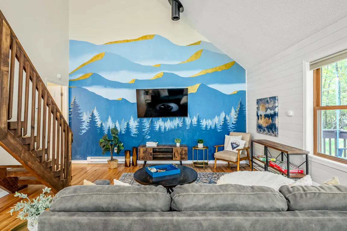 Stylish lightingSleek galley kitchenStone countersGuest roomsMain-level primary suiteThoughtful finishesHand-painted mountain mural