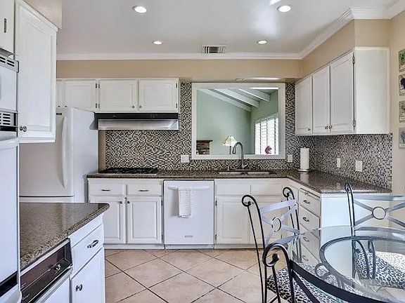 - Kitchen with solid "white colored" wood cabinets, lots of granite counter top space, stainless steel sink & gas cooktop with hood vent, & dishwasher