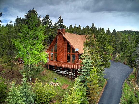 Well maintained home perched on top of Conifer Mountain, with incredible VIEWS of Pikes Peak! PAVED, circular driveway provides access to back door/kitchen for easy grocery unloading! Beautiful & functional kitchen with granite counter tops, breakfast bar, and 2 pantries! The open living room has soaring ceilings & wood burning fireplace. You'll also find 2 spacious bedrooms, a full bath, & the laundry room on this main floor. Upstairs you are greeted by a loft, perfect as a sitting area or small office. The large master bedroom has vaulted ceilings, 3 closets, & a 5 piece master bath. The basement has its own private entrance, where you'll find a great sized family room with gas stove, another full bath, & access to the extra deep garage. Two sheds provide for even more storage. There is also enough parking space for a medium sized RV! NEW (2017) carpet throughout, NEW (2017) garage doors and NEW (2019) water heater! Septic system is designed for 3 bedrooms/6 persons.