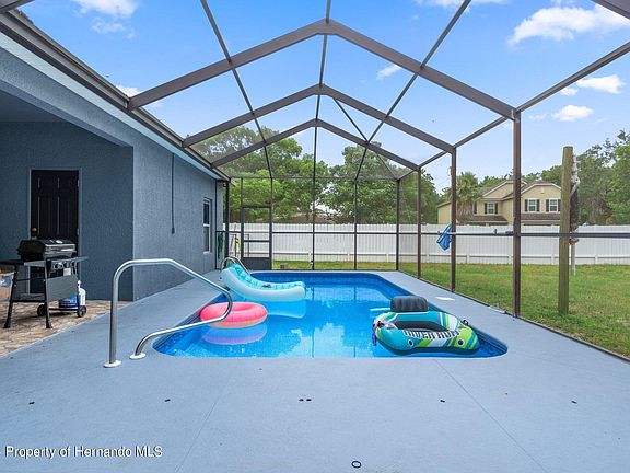 Active with contract, accepting back up offers. Amazing Spring Hill home! 4 bedrooms plus office/flex space, 2 full bathrooms, 2 car garage POOL home on a fully fenced corner lot! No HOA or CDD! New Roof 2022! Over 2200 SF of living space. Large covered entryway invites you into the foyer. Open floor plan offers views of the pool and outdoor space from the living room, kitchen, and master suite. Formal dining room, kitchen with breakfast nook and breakfast bar, large pantry, and SS appliances. Wood burning fireplace in the spacious living room. Living room and master suite both have sliding doors to access the pool patio. Large master ensuite recently updated, separate walk-in shower and soaking tub, double vanity, and huge walk-in closet! Second bathroom with shower/tub combo doubles as a pool bath for easy access. Inside laundry room with laundry sink; washer and dryer included. Enjoy the Florida lifestyle on the covered patio overlooking the pool and privacy fenced backyard. Pool liner replaced 4 years ago. Pool comes equipped with child safety fence. Large gate on one side of the fence is perfect for boat storage. Volleyball net and separately fenced dog run in the backyard. Shed in the backyard conveys for extra storage. Home is equipped with hurricane shutters. Conveniently located near amenities such as schools, grocery stores, retail shopping, dining, medical facilities, hospitals, and churches. Weeki Wachee Springs State Park, Weeki Wachee River, Rogers Park, Bayport, Pine Island, Linda Pedersen Park, and Hernando Beach Boat Ramp are all just a few minutes away and offer many options to get out on the water whether it be the Gulf of Mexico, Weeki Wachee River, or Mud River! Close proximity to the Suncoast Parkway, SR 50, and Commerical Way for easy commuting. This home has it all!