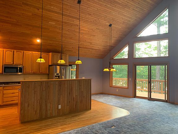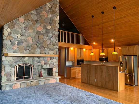 JOHNSON LAKE: Impressive cedar chalet-style home in the most convenient location! You'll feel like you're deep in the forest, with the mature pines that frame your lakefront residence (sugar-sand easy-slope frontage on full rec Johnson Lake)...but you're really only a few minutes from all the comforts and necessities! Health care, shopping, restaurants etc. so very close by. And the home is spectacular, with it's soaring vaulted ceilings, beautiful field stone fireplace and hardwood floors in the great room, nicely appointed primary suite complete with screened porch, fully finished walk-out lower level, chef's kitchen, home office, and room for everything and everyone. Massive attached garage and workshop areas (one portion heated) makes storage and hobbies effortless. Blacktop drive, high speed internet, backup generator, updated roof! Bright, airy upper loft area, generous-sized guest rooms on each floor, a well-built well-located home you'll be proud of.