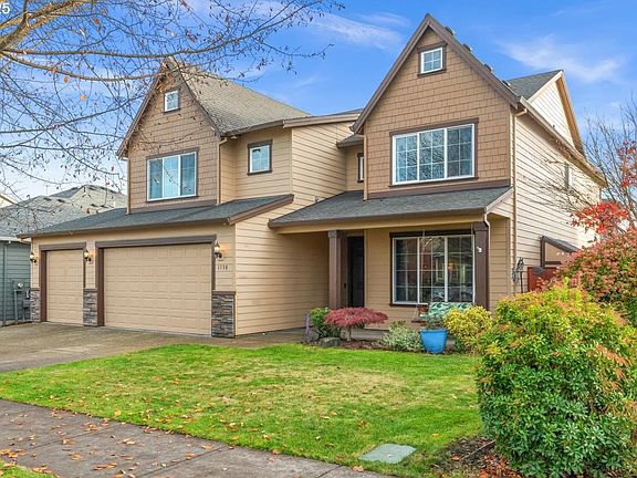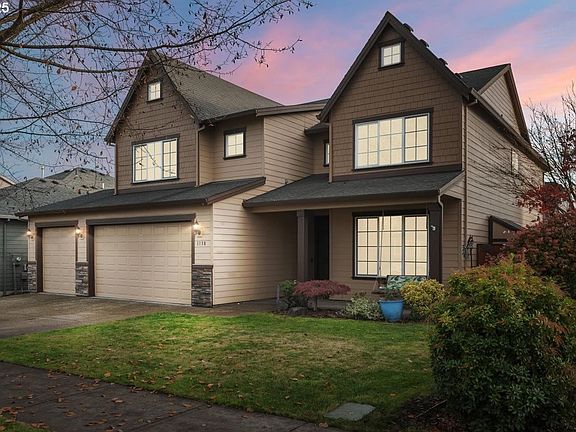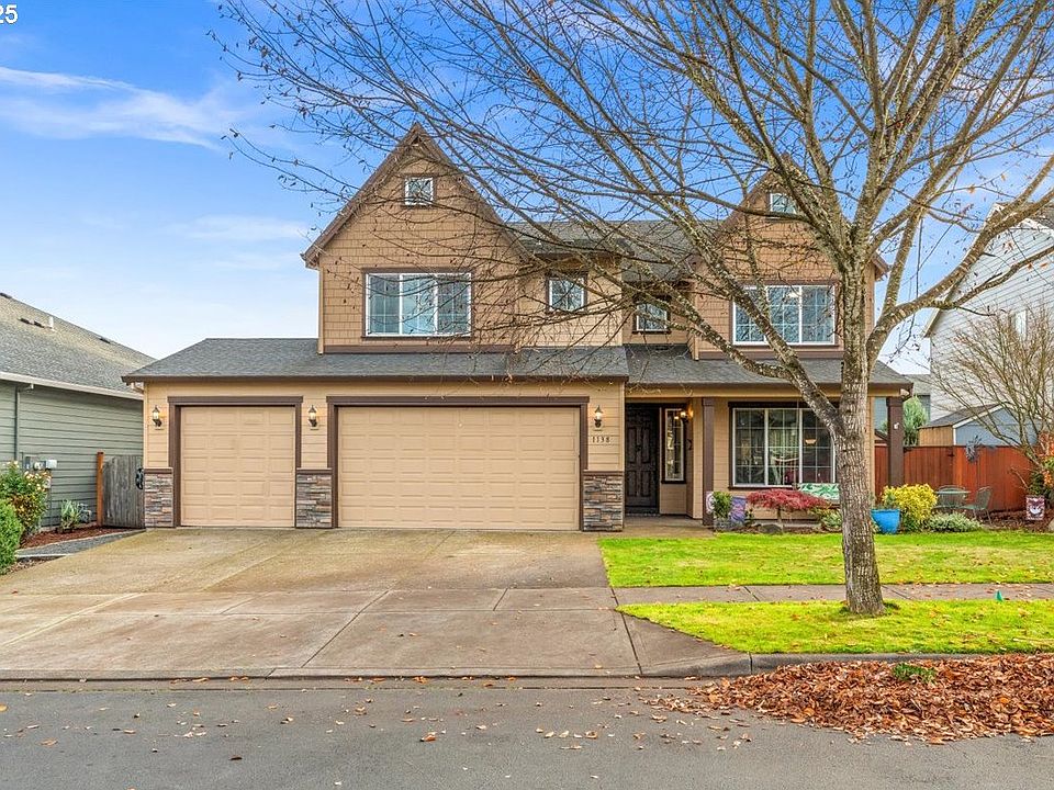 Step into this classy dual-living craftsman home, where timeless charm meets modern convenience. A wide driveway & darling front porch set the stage, welcoming you inside to an airy entryway with soaring ceilings & an open two-story stairwell that fills the space with natural light. The warm & inviting living room features a large picture window & flows seamlessly into the dining area, complete with a stylish bar & fridge—perfect for entertaining friends. The tastefully designed kitchen is a chef’s delight, showcasing granite slab countertops, a spacious island, pantry, double ovens, stainless steel appliances, & a cozy dining nook that opens to an expansive covered deck. Just beyond, the family room offers high ceilings, a sunny window, & a charming corner fireplace. A main floor bedroom with an adjacent bath provides an ideal setup for in-law quarters or guests. Upstairs, the wide stairwell leads to a luxurious primary suite with double-door entry, dual sink vanity, soaking tub, step-in shower, & a generous walk-in closet. The bonus room, finished with wood laminate flooring, a large storage closet, & designer paint, offers endless possibilities for a playroom, office, or media space. Additional bedrooms are generously sized with ample closet space, while the convenient upstairs laundry room includes a full closet & shelving to keep everything organized. Outdoor living shines in the fenced backyard, complete with a basketball area, firepit, & multiple entertainment zones. Relax on the covered Trex deck with a built-in hot tub, or host gatherings on the second deck featuring a built-in bar & gazebo designed for grilling & fun. An oversized three-car garage with car charging hook-up & a workshop area provides plenty of space for projects, & the included air compressor is a bonus. Welcoming neighborhood with multiple parks, & just down the road from David Hill Winery. Enjoy the perks of small-town living with a vibrant farmers market, chalk festival & holiday parade.