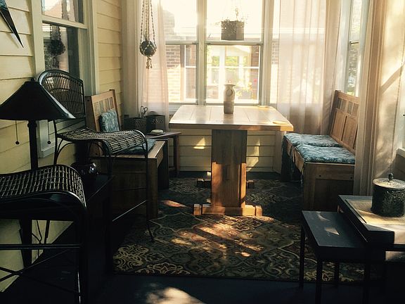 Character wood trim accents. Hardwood floors, gas fireplace, solarium with French doors, updated kitchen, Maple cabinets, 3 season front porch, fenced back yard, extra parking pad.