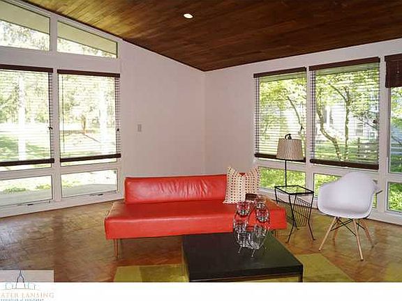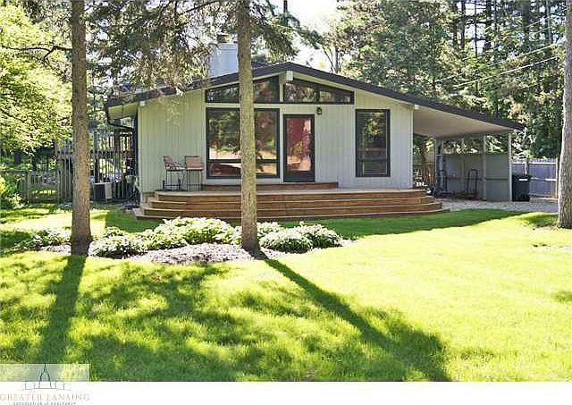 Mad Men Mid-Century Modern tri-level- it's the real thing, Just like a Hollywood Hills retreat in Atomic Ranch magazine. Emerson Park is across the street and Trowbridge Plaza Fresh Thyme grocery store, restaurants, busline and MSU are all in walking distance. You can hop on the highway in seconds for easy travel. This stylish home is tucked into the lush woody landscape and surrounded by decks, patio, and gardens around a full swimming pool. Home is clad with cedar and has soaring redwood celings in the open great room and kitchen. New gourmet kitchen has high end appliances, a lovely eating area looking out to the front garden, and is designed to fit the period. Floor to ceiling brick fireplace anchors the great room floor plan. Outsize windows wash the room with light and two skylights add illumination. Original wood parquet and ceramic tile floors in the great room and kitchen area are beautiful and easy to maintain. Three large bedrooms are up a few steps and serviced by a fine, refurbished large bath. One bedroom or office has an outside door with decking and steps down to the garden and pool. Lower level has a a generous rec room with large windows and a new half bath adjacent. There is abundant storage in the lower level and a large laundry and workroom with a door and stairs to the private backyard. This home has been very well maintained and redecorated and is ready to move in.